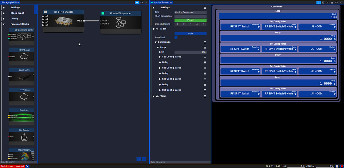 RF SP4T -kytkinlohkoa voidaan käyttää itsenäisenä laitteena tai tehtävän sisällä. Lohko tarjoaa IO-vaihto-option (laiteliitäntätila), joka muuttaa lohkon ”4 sisään 1 ulos”- tai ”4 ulos 1 sisään” -versioksi. (Ei sisällä laitteistoa)
