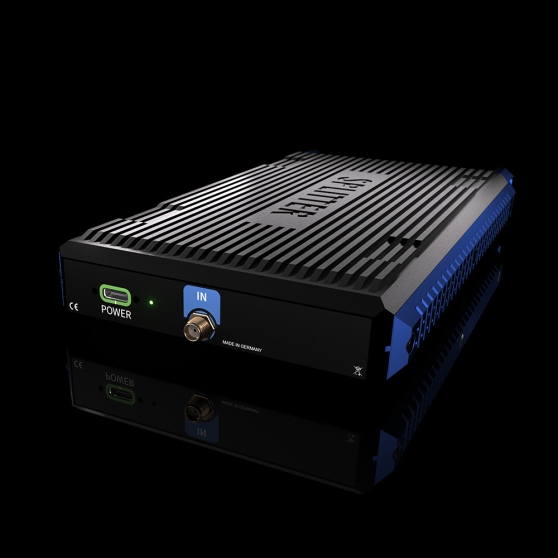 Ulkoinen, aktiivinen, pienihäviöinen 4-tie-jakaja, 700 MHz – 6 GHz (esim. yhdistää useita V6-yksiköitä reaaliaikaisen kaistanleveyden laajentamiseksi).