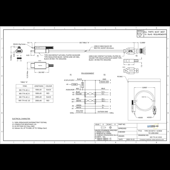 Aaronia USB 3.0 -kaapeli, tyyppi A – tyyppi C (10Gbit/s / 60W)