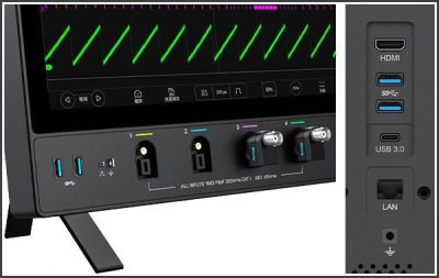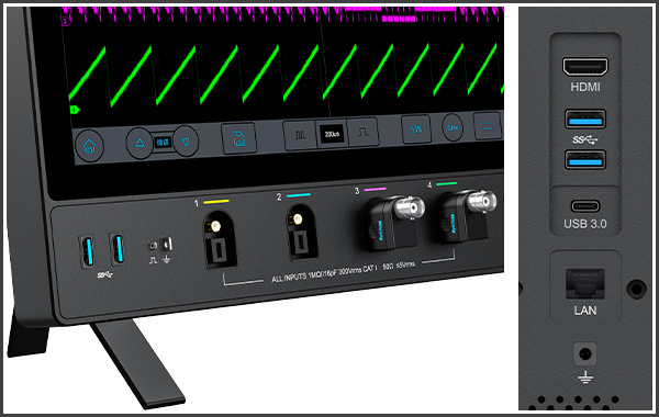 Alkuperäinen Mic-OPI™-mittapään käyttöliittymä, tunnistaa automaattisesti passiivisen mittapään vaimennuksen, yksi napsautus jatkaa automaattista kalibrointia; vakiona BNC-sovitin, myös USB 3.0 Host, USB Type-C, LAN, HDMI, Trigger out jne.