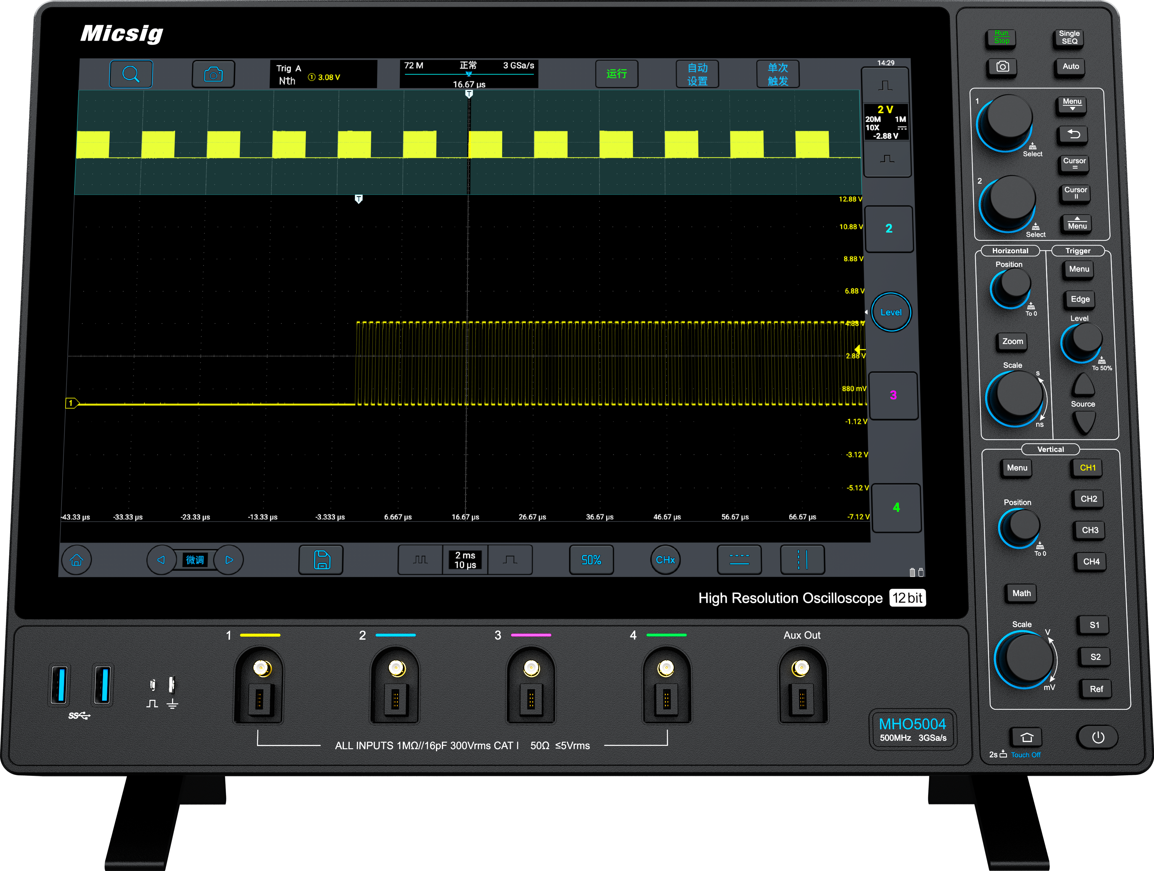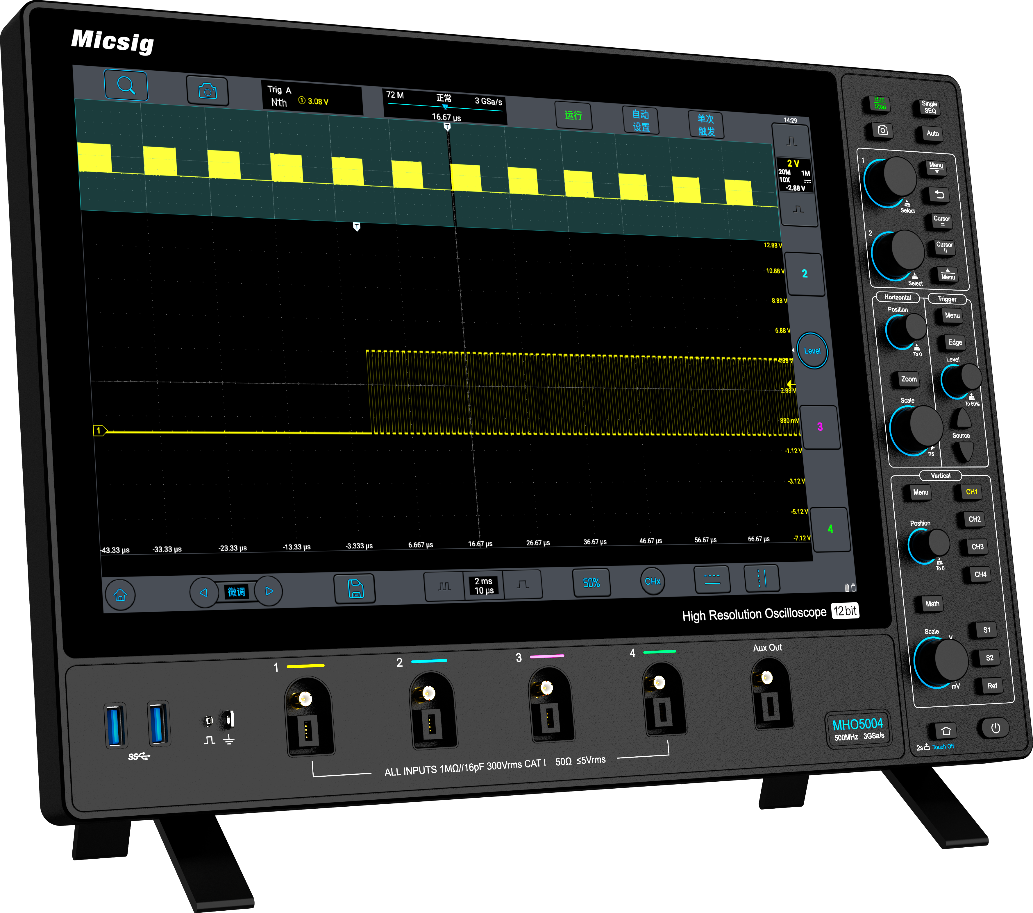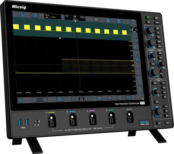 MHO3 -sarjassa on 12-bittinen, korkearesoluutioinen ADC (analog-to-digital-converter), jonka kvantisointitaso on jopa 4096, mikä on 16 kertaa perinteiseen 8-bittiseen ADC:hen verrattuna. Tämä auttaa käyttäjiä tarkkailemaan aaltomuodon yksityiskohtia kattavammin ja selkeämmin.