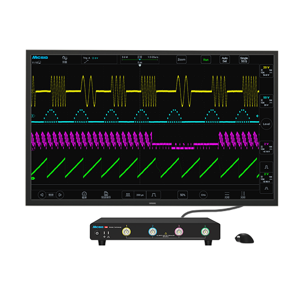 Micsig MO3-sarjan korkearesoluutioinen, modulaarinen oskilloskooppi on vain 3 cm korkea, joten se on paljon tilaa säästävä ratkaisu työpöydille ja testiräkkeihin. MO3-sarjassa on 12-bittinen, tarkka AD-muunnin, joka tarjoaa jopa 500 MHz:n analogisen kaistanleveyden (MO34-500-malli), 3 GSa/s:n reaaliaikaisen näytteistysnopeuden, 360 Mpts:n muistisyvyyden ja 4 analogista kanavaa. Tukee HDMI-suoraliitäntää saumattomaan pääsyyn suurille näytöille ilman ohjelmistoasennuksia. Käyttäjät voivat ohjata oskilloskooppia hiirellä yksinkertaisen ja intuitiivisen käytön takaamiseksi. Tukee oskilloskooppien ketjuttamista jopa 16 kanavalla, mikä vähentää tehokkaasti monikanavaisten oskilloskooppien käyttökustannuksia. Tukee PC-pohjaista oskilloskooppien kauko-ohjausta, SCPI-protokollaa, sekundaarista kehitystä ja nopeaa tiedonsiirtoa, mikä tekee siitä parhaan valinnan testijärjestelmien integrointiin.