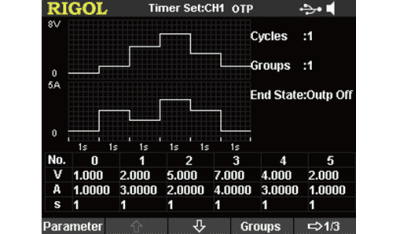 Kun ajastin on päällä, laite antaa esiasetetun jännitteen ja virran (jopa 2048 ryhmää). Käyttäjä voi asettaa ajastimen lähtöryhmien lukumäärän ja asettaa kunkin ryhmän lähtöjännitteen, virran ja ajastusajan.