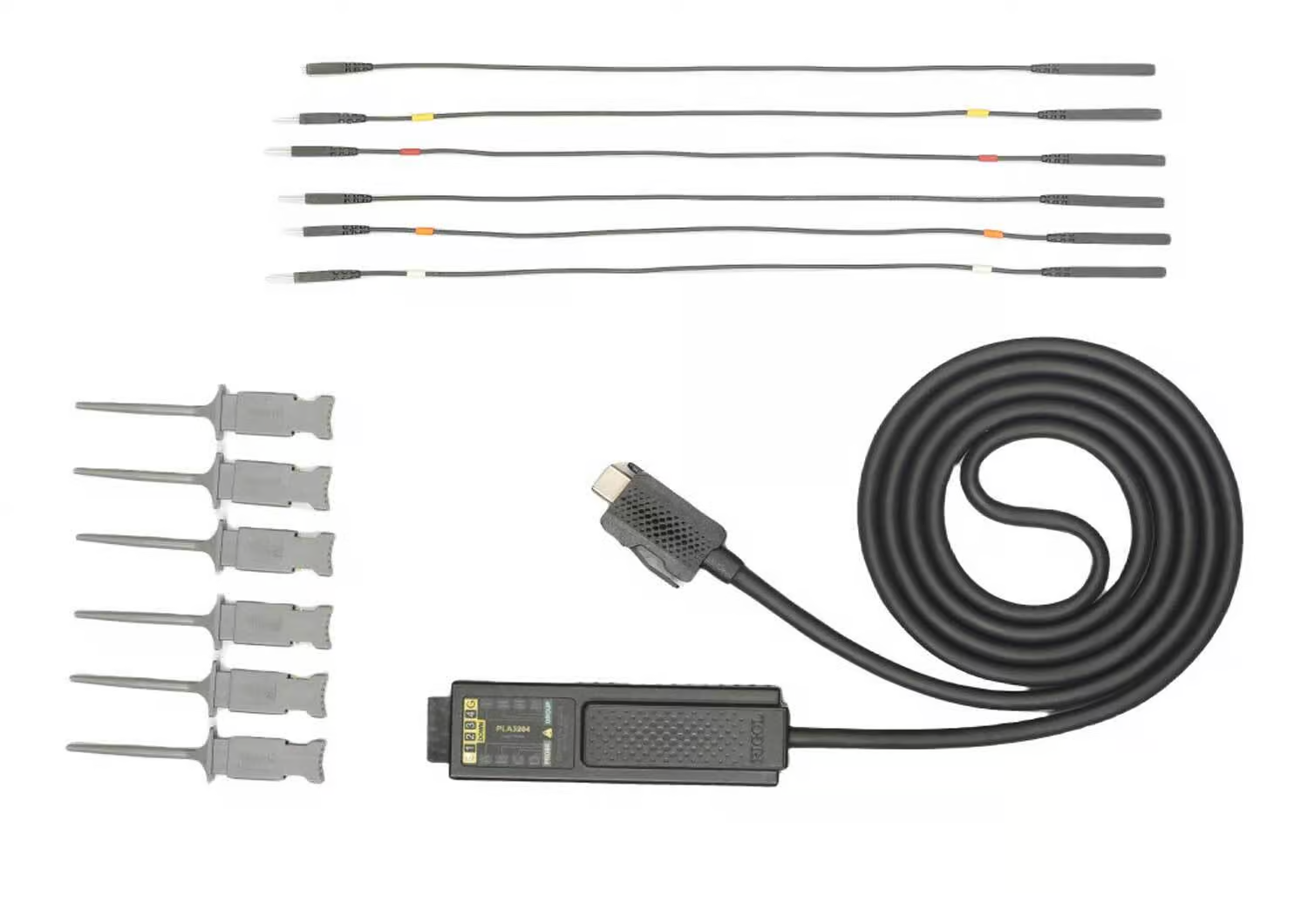 PLA3204 yhdistää testattavan järjestelmän digitaaliset signaalit RIGOL MHO/DHO5000 -sarjan ja MHO2000-sarjan digitaaliseen oskilloskooppiin USB Type-C -liittimensä kautta, mikä mahdollistaa logiikka-analysaattoritoiminnon. PLA3204 sisältää 4 datakanavaa ja 8 maadoituskanavaa. Anturin pään etiketissä kaikki datakanavat on merkitty numeroilla, joiden avulla voit tunnistaa eri kanavat. Lisäksi PLA3204:ssä on vakiona 4 signaalijohdinta ja 2 maadoitusjohdinta joustavia liitäntöjä varten.