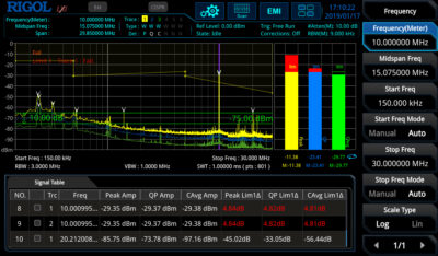 RSA3000E:n sisäänrakennettu EMI-esiyhteensopivuusohjelmisto yhdistettynä CISPR-yhteensopiviin suodattimiin esitestaa tuotteen johtavuuden ja säteilyn tunnistaakseen johtavuus-/säteilyhäiriölähteen.