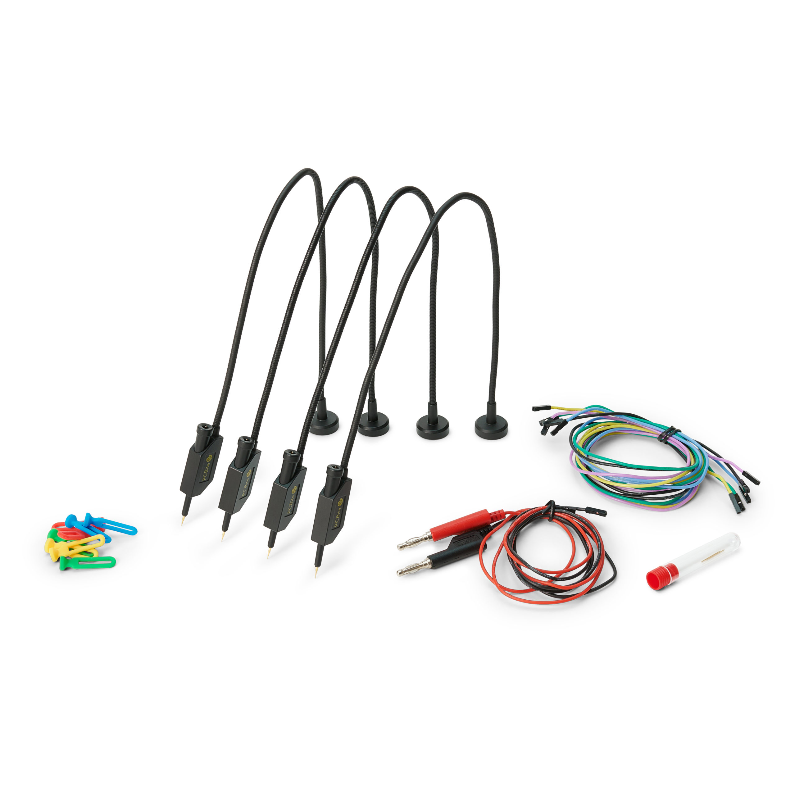 Neljä täydellistä handsfree-käyttöistä SQ10-mittapäätä, jotka on pakattu testijohtoineen kytkettäväksi suoraan logiikka-analysaattoriin, yleismittariin tai haluamaasi työkaluun.