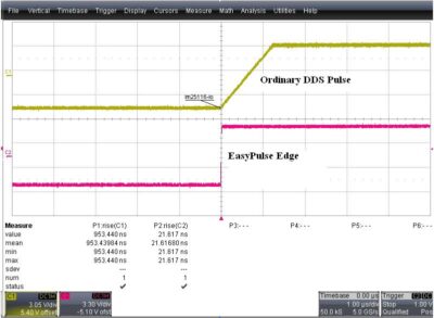 Kuten alla olevassa kuvassa näkyy, 1 kHz:n taajuudella EasyPulse pystyy pitämään yllä nopeaa nousevaa/laskevaa reunaa (20 ns), kun taas tavallisen DDS:n reuna on erittäin hidas.