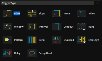 Edge, Slope, Pulse, Video, Windows, Runt, Interval, Dropout, Pattern. Trigger Zone on saatavilla edistyneeseen liipaisuun.