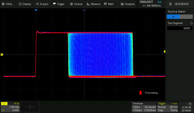 - Aaltomuodon päivitysnopeus on jopa 100 000 wfm/s, joten oskilloskooppi voi siepata helposti epätavallisia tai pienen todennäköisyyden tapahtumia. Sekvenssitilassa aaltomuodon sieppausnopeus voi olla 500 000 wfm/s.